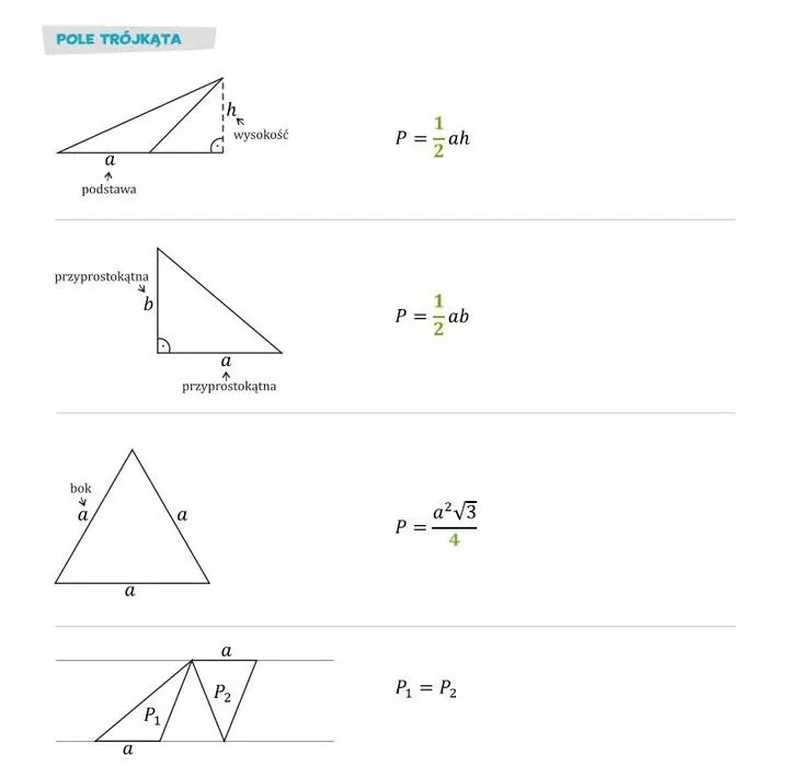 - Klasyczny wzór na pole trójkąta to \( P = \frac{1}{2}ah \), gdzie \(a\) to bok, a \(h\) to wysokość.